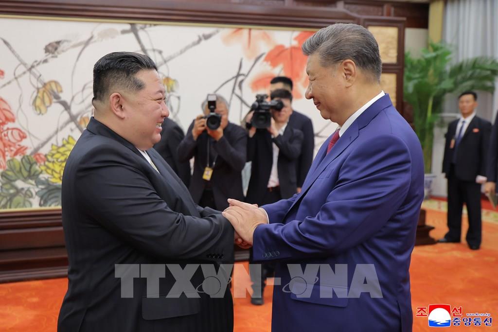Ngày 4/9/2025, Chủ tịch Trung Quốc Tập Cận Bình có cuộc hội đàm với nhà lãnh đạo Triều Tiên Kim Jong Un tại thủ đô Bắc Kinh. Đây là cuộc gặp trực tiếp đầu tiên giữa hai nhà lãnh đạo trong hơn 6 năm qua, kể từ sau hội nghị thượng đỉnh ở Bình Nhưỡng hồi tháng 6/2019. Chủ tịch Tập Cận Bình nhấn mạnh Trung Quốc và Triều Tiên là "hàng xóm tốt, bạn bè tốt và đồng chí tốt của nhau, cùng chia sẻ vận mệnh chung và luôn sát cánh bên nhau". Về phần mình, nhà lãnh đạo Triều Tiên Kim Jong Un bày tỏ mong muốn tiếp tục làm sâu sắc và phát triển quan hệ với Trung Quốc. Ảnh: KCNA/TTXVN