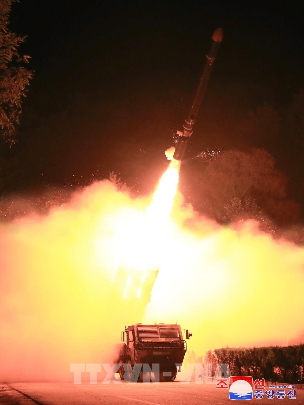 Triều Tiên đã phóng thử 2 tên lửa hành trình chiến lược tầm xa vào ngày 12/10/2022, trong khuôn khổ cuộc tập trận nhằm kiểm tra khả năng hạt nhân chiến thuật của nước này. Nhà lãnh đạo Triều Tiên Kim Jong-un đã giám sát vụ phóng trên và bày tỏ hài lòng về khả năng phản ứng cao của các lực lượng tác chiến hạt nhân. Đây là thông báo vừa được Hãng thông tấn Trung ương Triều Tiên (KCNA) đưa ra ngày 13/10. Trong ảnh: Một trong hai tên lửa hành trình chiến lược tầm xa của Triều Tiên được phóng thử trong cuộc tập trận ngày 12/10/2022. Ảnh: YONHAP/TTXVN