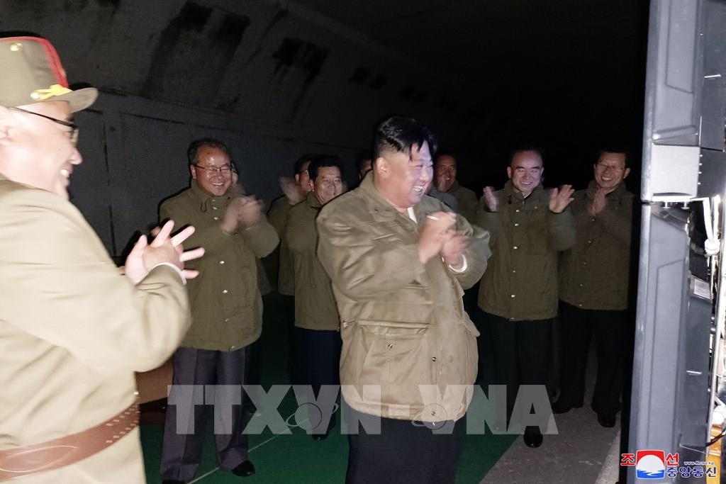Triều Tiên đã phóng thử 2 tên lửa hành trình chiến lược tầm xa vào ngày 12/10/2022, trong khuôn khổ cuộc tập trận nhằm kiểm tra khả năng hạt nhân chiến thuật của nước này. Nhà lãnh đạo Triều Tiên Kim Jong-un (giữa) giám sát vụ phóng trên và bày tỏ hài lòng về khả năng phản ứng cao của các lực lượng tác chiến hạt nhân. Đây là thông báo vừa được Hãng thông tấn Trung ương Triều Tiên (KCNA) đưa ra ngày 13/10. Ảnh: YONHAP/TTXVN