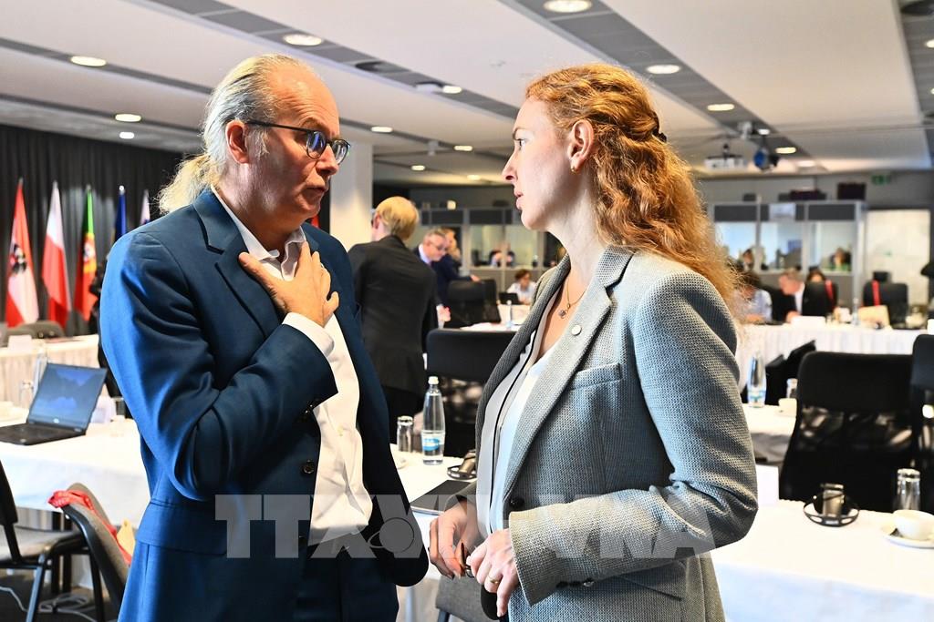 Ngày 12/10/2022, tại Hội nghị không chính thức Bộ trưởng Năng lượng các quốc gia thành viên Liên minh châu Âu (EU) ở Praha (CH Séc), các Bộ trưởng Năng lượng EU đã đạt được thoả thuận về việc mua chung khí đốt trước mùa Hè 2023, tăng cường đoàn kết và tiết kiệm năng lượng, đồng thời nhất trí với kiến nghị cần phải ngăn chặn tác động của giá khí đốt lên giá điện. Trong ảnh: Bộ trưởng Năng lượng Luxembourg Claude Turmes (trái) và Bộ trưởng Chuyển đổi Sinh thái Pháp Sophie Mourlon tại Hội nghị không chính thức Bộ trưởng Năng lượng EU ở Praha (CH Séc) ngày 12/10/2022. Ảnh: AFP/TTXVN