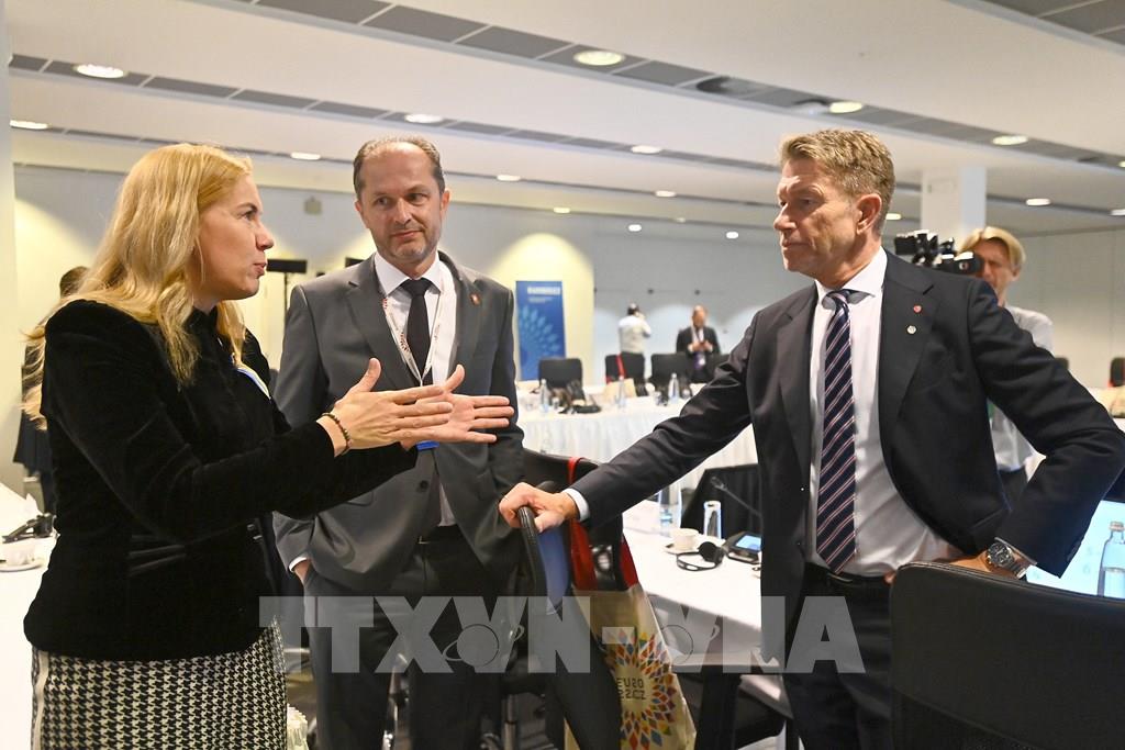 Ngày 12/10/2022, tại Hội nghị không chính thức Bộ trưởng Năng lượng các quốc gia thành viên Liên minh châu Âu (EU) ở Praha (CH Séc), các Bộ trưởng Năng lượng EU đã đạt được thoả thuận về việc mua chung khí đốt trước mùa Hè 2023, tăng cường đoàn kết và tiết kiệm năng lượng, đồng thời nhất trí với kiến nghị cần phải ngăn chặn tác động của giá khí đốt lên giá điện. Trong ảnh: Ủy viên châu Âu phụ trách Năng lượng Kadri Simson (trái), Giám đốc Văn phòng Năng lượng Thụy Sĩ Benoit Revaz (giữa) và Bộ trưởng Năng lượng-Dầu mỏ Na Uy Terje Aasland (phải) tại hội nghị. Ảnh: AFP/TTXVN