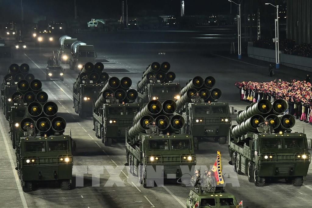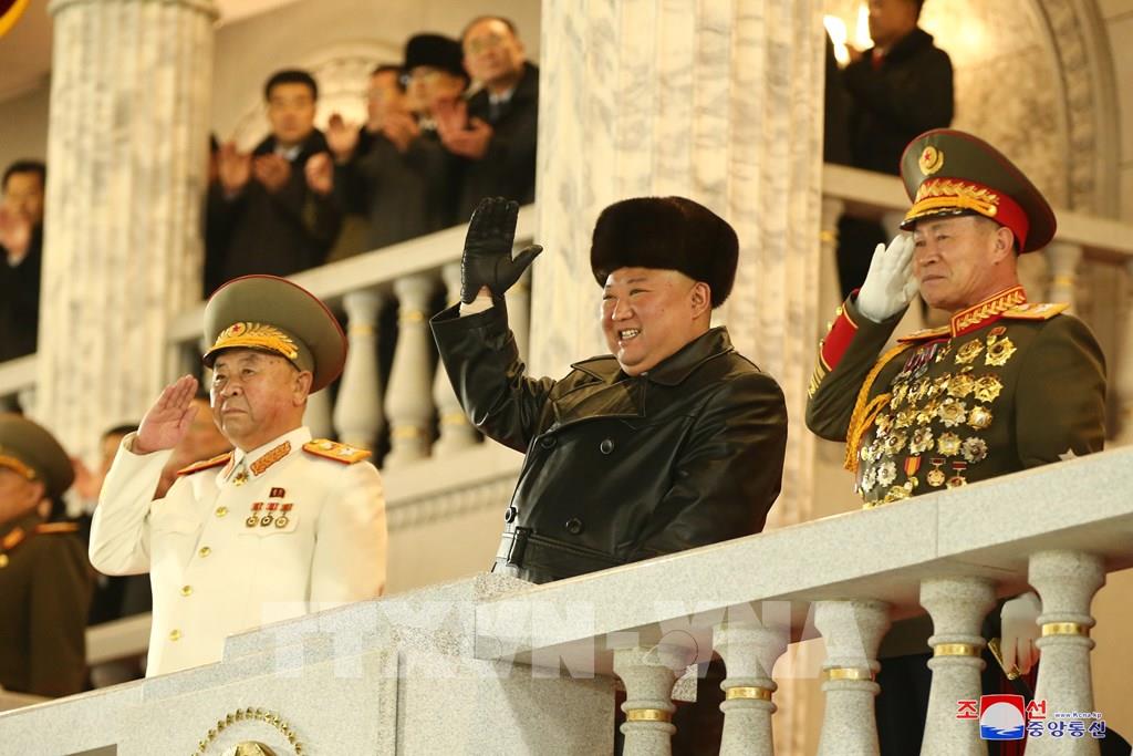 Truyền thông nhà nước Triều Tiên đưa tin nước này đã tổ chức lễ duyệt binh vào tối 14/1 ở thủ đô Bình Nhưỡng để chào mừng thành công của Đại hội lần thứ VIII Đảng Lao động Triều Tiên. Nhà lãnh đạo Kim Jong-un đã tham dự sự kiện này. Ảnh: KCNA/TTXVN