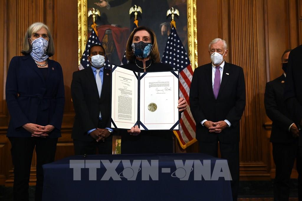 Ngày 13/1/2021, với đa số phiếu tán thành, Hạ viện Mỹ đã thông qua nghị quyết với điều khoản luận tội duy nhất đối với Tổng thống Donald Trump, theo đó cáo buộc ông chủ Nhà Trắng kích động bạo loạn chống Chính phủ. Động thái này mở đường cho phiên tòa xét xử ông Trump tại Thượng viện trong thời gian tới. Trong ảnh: Chủ tịch Hạ viện Mỹ Nancy Pelosi (giữa) cùng các quan chức Hạ viện công bố điều khoản luận tội Tổng thống Donald Trump tại Washington, DC. Ảnh: AFP/TTXVN