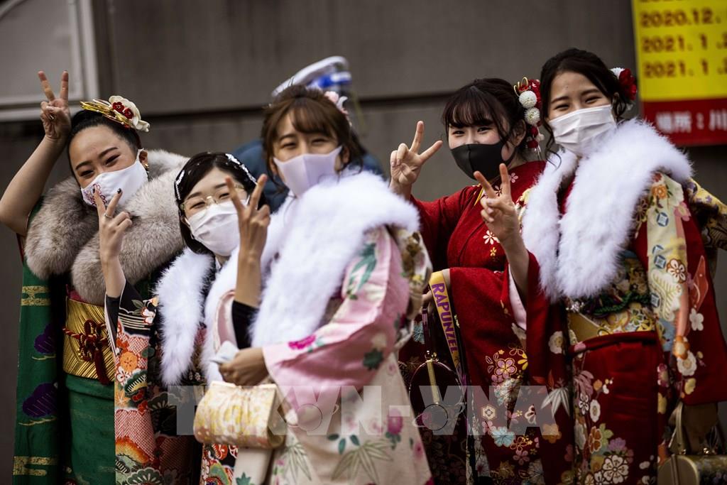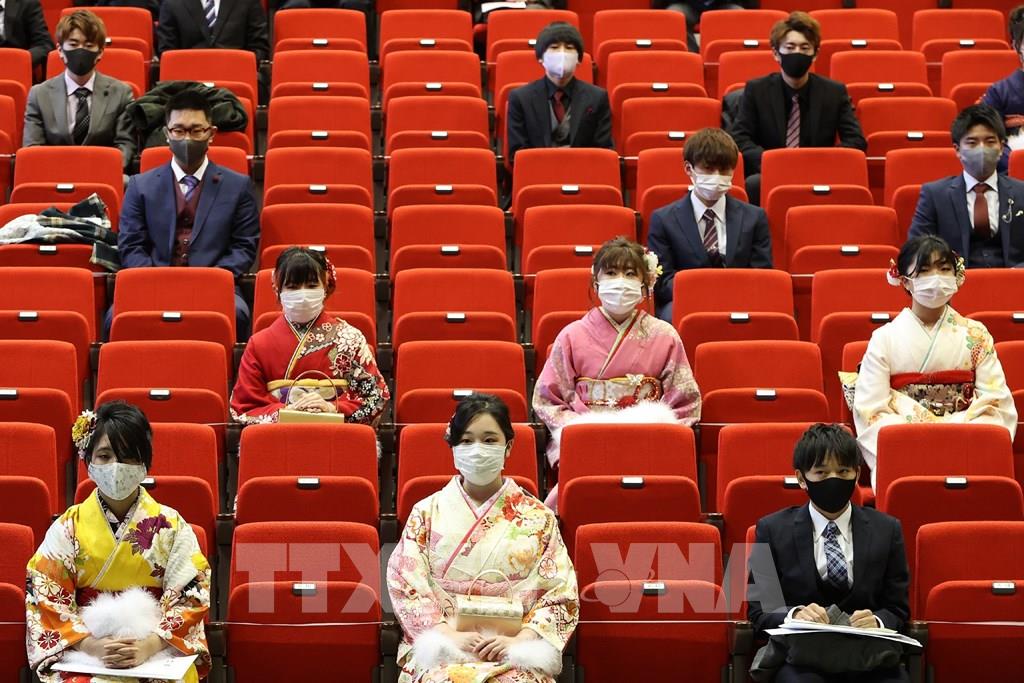 Đến hẹn lại lên, vào đầu tháng 1, người dân Nhật Bản lại nô nức tổ chức Lễ trưởng thành để đón chào những thanh niên bước sang tuổi 20. Năm nay, dịch bệnh COVID-19 bùng phát đã buộc Chính phủ Nhật Bản phải ban bố tình trạng khẩn cấp kéo dài một tháng xung quanh khu vực thủ đô Tokyo, khiến một số địa phương phải hủy bỏ sự kiện hoặc lựa chọn hình thức phù hợp. Tại nhà thi đấu Yokohama - khu vực đang phải áp đặt tình trạng khẩn cấp - những cô gái trẻ trong bộ kimono rực rỡ sắc màu, đeo khẩu trang, còn các chàng thanh niên chủ yếu mặc vest, xếp hàng hoặc ngồi theo đúng hàng ghế được quy định do giãn cách xã hội. Một số địa phương buổi lễ này buộc phải tổ chức trực tuyến. Ảnh: AFP/TTXVN