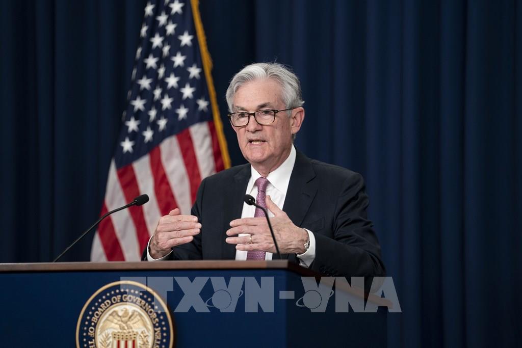 Ngày 14/12, Ngân hàng Dự trữ Liên bang Mỹ (Fed) quyết định nâng biên độ lãi suất cơ bản thêm 50 điểm, lên khoảng 4,25 - 4,5%. Đây là đợt tăng lãi suất nhỏ nhất của Fed kể từ tháng 6/2022. Ảnh: Chủ tịch Fed Jerome Powell trong cuộc họp báo công bố quyết định tăng lãi suất mới, tại Washington, DC ngày 14/12/2022. AFP/TTXVN