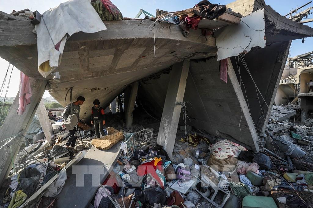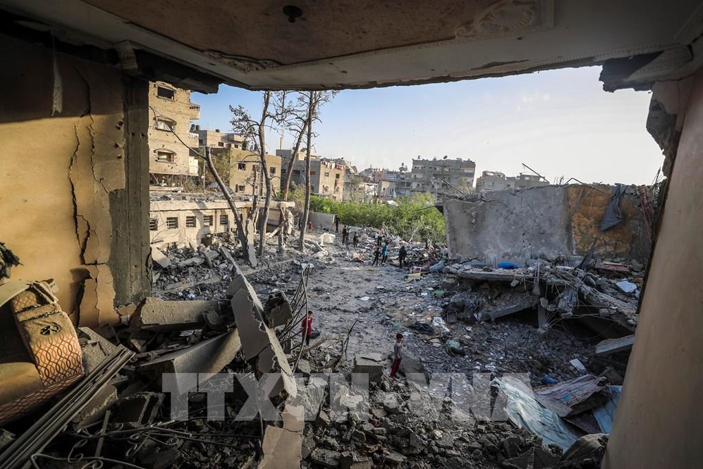 Ngày 14/5/2025, cơ quan y tế tại Dải Gaza cho biết các cuộc không kích của quân đội Israel đã khiến ít nhất 80 người Palestine thiệt mạng trên khắp vùng lãnh thổ này trong bối cảnh Israel đang đẩy mạnh không kích trong khi Tổng thống Mỹ Donald Trump đang có chuyến công du Trung Đông. Ảnh: Cảnh đổ nát sau vụ không kích của Israel tại Jabalia, Dải Gaza. THX/TTXVN