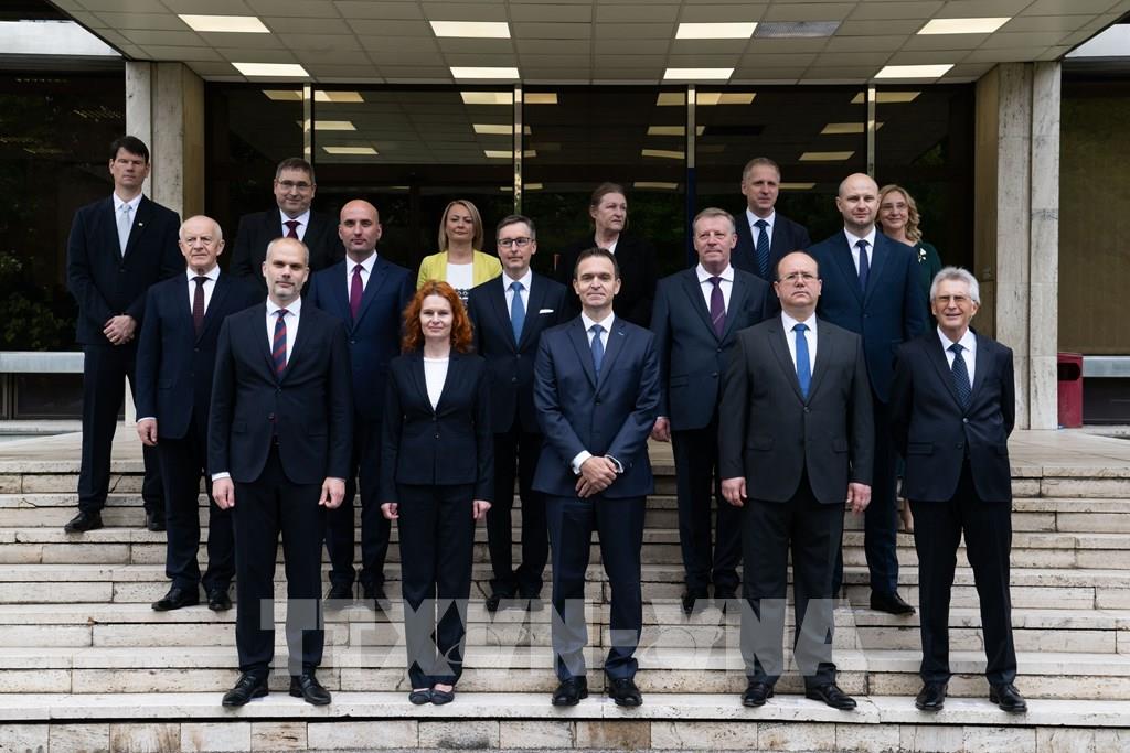 Ngày 15/6/2023, Chính phủ của Thủ tướng Slovakia Ludovit Odor đã thất bại trong cuộc bỏ phiếu tín nhiệm tại Quốc hội khi chỉ nhận được 34 phiếu ủng hộ trong tổng số 136 nghị sĩ có mặt. Căn cứ Hiến pháp Slovakia, Tổng thống Slovakia Zuzana Caputova sẽ giải tán Nội các và giao nhiệm vụ cho Chính phủ tạm quyền với quyền lực hạn chế. Ảnh: Thủ tướng Slovakia Ludovit Odor (giữa, hàng đầu) chụp ảnh cùng các Bộ trưởng Nội các tại Bratislava, ngày 15/5/2023. Ảnh: AFP/TTXVN