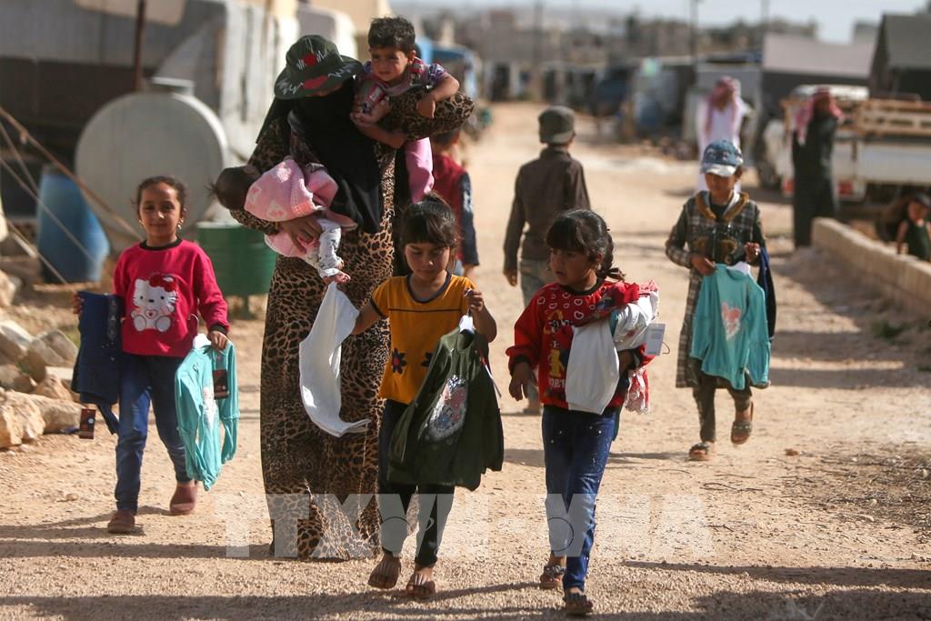 Liên minh châu Âu (EU) ngày 15/6/2023 cam kết chi 560 triệu euro để giúp đỡ những người Syria phải chạy trốn khỏi đất nước bị tàn phá bởi chiến tranh kể từ năm 2011 này. Ảnh: Trẻ em tị nạn nhận quần áo từ thiện tại tỉnh Idlib, Syria. Ảnh: AFP/TTXVN