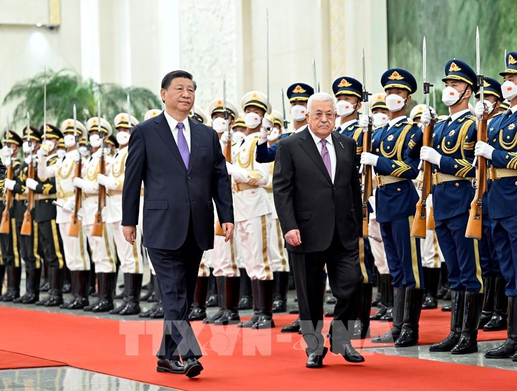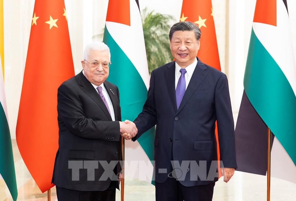 Thảo luận với Tổng thống Palestine Mahmoud Abbas đang trong chuyến thăm Bắc Kinh, ngày 14/6/2023, Chủ tịch Trung Quốc Tập Cận Bình đã đề xuất 3 điểm giúp giải quyết vấn đề của Palestine. Đầu tiên, giải pháp cơ bản nằm ở việc thiết lập một nhà nước Palestine độc lập, có đầy đủ chủ quyền trên cơ sở cách phân định biên giới năm 1967, với Đông Jerusalem là thủ đô. Thứ hai, những nhu cầu về kinh tế Palestine và đời sống của người dân cần được đáp ứng, cộng đồng quốc tế cần tăng cường hỗ trợ phát triển và cứu trợ nhân đạo cho Palestine. Thứ ba, điều quan trọng là duy trì hướng đàm phán hòa bình đúng đắn. Ảnh: THX/TTXVN
