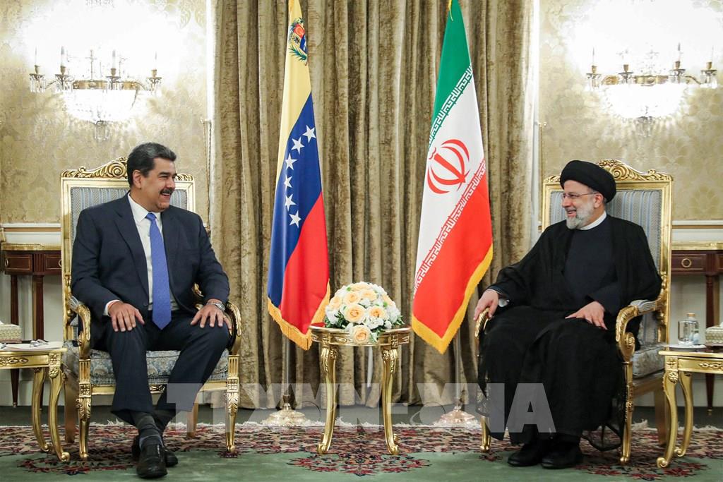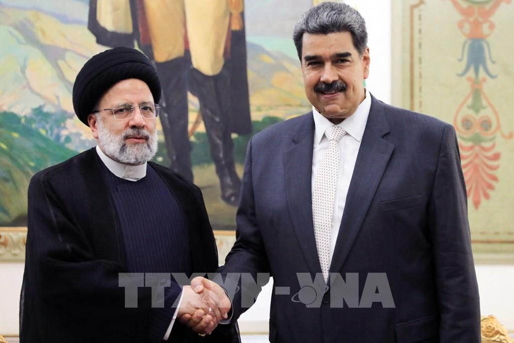 Ngày 12/6/2023, trong chuyến thăm của Tổng thống Iran Ebrahim Raisi tới Venezuela, hai bên đã nhất trí tăng cường hợp tác chiến lược trong nhiều lĩnh vực và ký 25 thỏa thuận hợp tác nhằm thúc đẩy tăng trưởng kinh tế của cả hai quốc gia. Ảnh: Tổng thống Iran Ebrahim Raisi (phải) và Tổng thống Venezuela Nicolas Maduro tại cuộc gặp ở Caracas ngày 12/6/2023. Ảnh: AFP/TTXVN