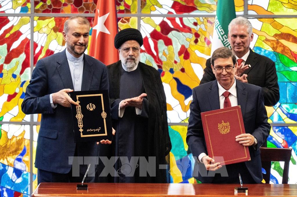 Ngày 15/6/2023, Cuba và Iran đã ký các thỏa thuận hợp tác về chính sách đối ngoại, viễn thông và tư pháp nhân chuyến thăm Cuba của Tổng thống Iran Ebrahim Raisi. Ảnh: Ngoại trưởng Cuba Bruno Rodriguez (phải, trước) và Ngoại trưởng Iran Hossein Amir-Abdollahian (trái) ký các hiệp định hợp tác song phương trước sự chứng kiến của Chủ tịch Cuba Miguel Diaz-Canel (phải, sau) và Tổng thống Iran Ebrahim Raisi (thứ 2, trái) tại thủ đô La Habana, Cuba, ngày 15/6/2023. Ảnh: AFP/TTXVN