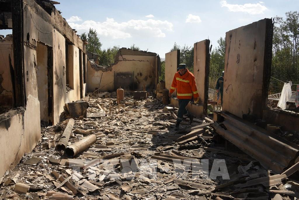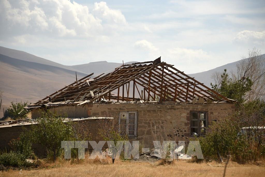 Đụng độ đã nổ ra giữa quân đội Armenia và Azerbaijan vào đêm 12/9/2022, đánh dấu bước leo thang trong căng thẳng đã kéo dài hàng thập kỷ giữa 2 bên liên quan đến khu vực tranh chấp Nagorny-Karabakh. Armenia và Azerbaijan đã nhất trí ngừng bắn, bắt đầu từ 9h giờ địa phương ngày 13/9, tuy nhiên thỏa thuận chỉ được duy trì trong vài phút. Trong cuộc đụng độ diễn ra ngày 13/9, ít nhất 50 binh sĩ Azerbaijan và 49 binh sĩ Armenia đã thiệt mạng. Trong ảnh: Ngôi nhà bị phá hủy trong cuộc đụng độ giữa các lực lượng Armenia và Azerbaijan, tại Sotk, Armenia, ngày 14/9/2022. Ảnh: AFP/ TTXVN
