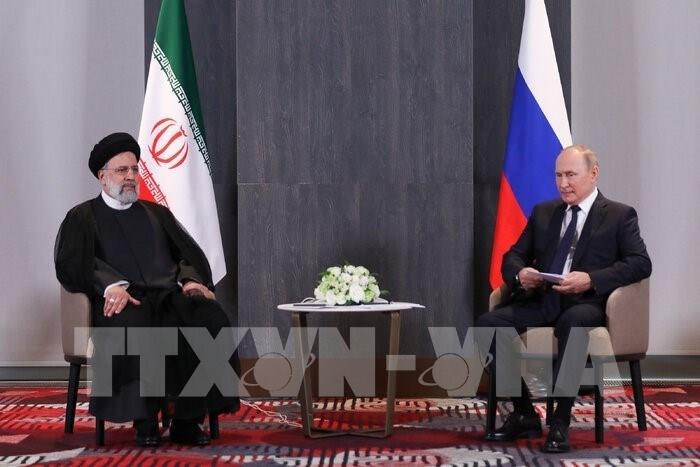 Quan hệ giữa Nga và Iran đang phát triển tích cực. Đây là đánh giá của Tổng thống Nga Vladimir Putin (phải) trong cuộc gặp Tổng thống Iran Ebrahim Raisi (trái), diễn ra ngày 15/9/2022 bên lề hội nghị thượng đỉnh Tổ chức Hợp tác Thượng Hải (SCO) tại thành phố Samarkand của Uzbekistan. Ảnh: IRNA/ TTXVN