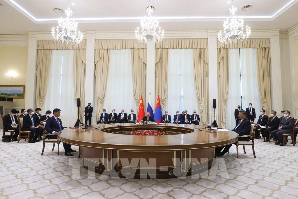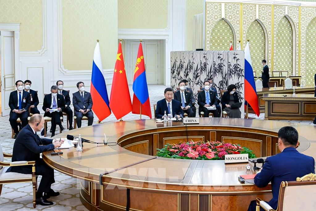 Nga quan tâm tới hợp tác với Trung Quốc và Mông Cổ bởi hai nước này có chung cách tiếp cận với Moskva trong phần lớn các vấn đề toàn cầu. Tổng thống Nga Vladimir Putin (trái) đưa ra tuyên bố này ngày 15/9/2022 trong cuộc họp với Chủ tịch Trung Quốc Tập Cận Bình (giữa) và Tổng thống Mông Cổ Ukhnaagiin Khurelsukh (phải), bên lề hội nghị thượng đỉnh Tổ chức Hợp tác Thượng Hải (SCO) ở thành phố Samarkand của Uzbekistan. Ảnh: THX/ TTXVN