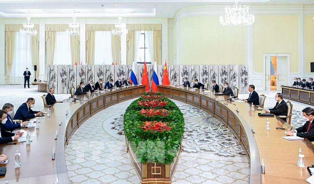 Ngày 15/9/2022, bên lề Hội nghị thượng đỉnh Tổ chức Hợp tác Thượng Hải (SCO) lần thứ 22 tại thành phố Samarkand (Uzbekistan), Tổng thống Nga Vladimir Putin và Chủ tịch Trung Quốc Tập Cận Bình đã hội đàm trực tiếp. Tổng thống Putin bày tỏ tin tưởng rằng cuộc hội đàm này sẽ tạo thêm động lực cho quan hệ đối tác chiến lược Nga-Trung. Về phần mình, Chủ tịch Tập Cận Bình khẳng định với tư cách là các cường quốc, Trung Quốc sẵn sàng cùng Nga đưa thế giới đang chứng kiến những thay đổi lớn lên quỹ đạo phát triển bền vững và tích cực. Ảnh: THX/ TTXVN