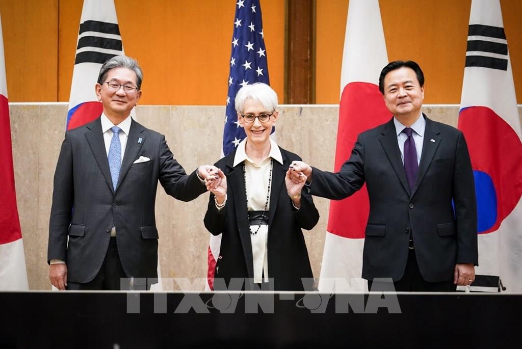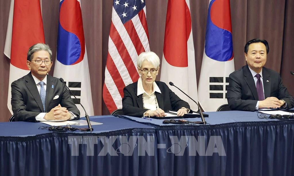 Cuộc hội đàm ba bên cấp Thứ trưởng Ngoại giao Hàn Quốc, Mỹ và Nhật Bản diễn ra tại thủ đô Washington, DC, Mỹ, ngày 13/2/2023. Tại cuộc gặp, Thứ trưởng Ngoại giao Mỹ Wendy Sherman (giữa) đã cùng những người đồng cấp Nhật Bản Takeo Mori (trái) và Hàn Quốc Cho Hyun-dong thảo luận các biện pháp tăng cường hợp tác ba bên. Ảnh: Kyodo/ TTXVN