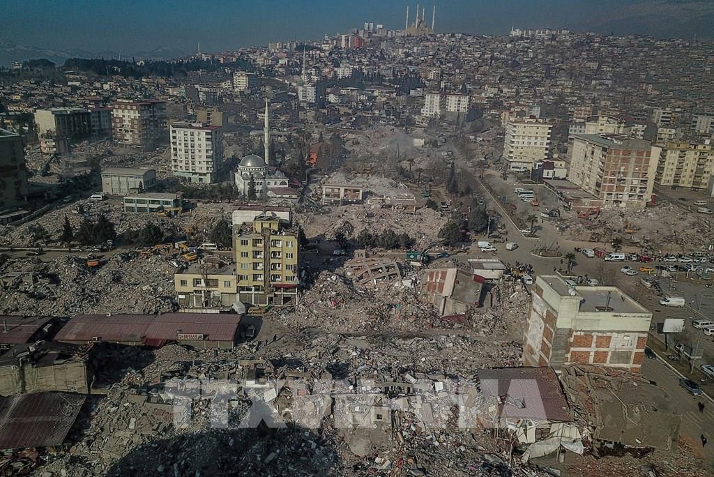 Tính đến sáng 17/2/2023, số nạn nhân thiệt mạng trong trận động đất kinh hoàng tại Thổ Nhĩ Kỳ và Syria đã lên tới hơn 42.000 người, trong đó tại Thổ Nhĩ Kỳ là 36.187 người, và Syria là hơn 5.800 người. Trong ảnh: Cảnh đổ nát sau trận động đất ở Kahramanmaras, Thổ Nhĩ Kỳ, ngày 14/2/2023. Ảnh: AFP/ TTXVN