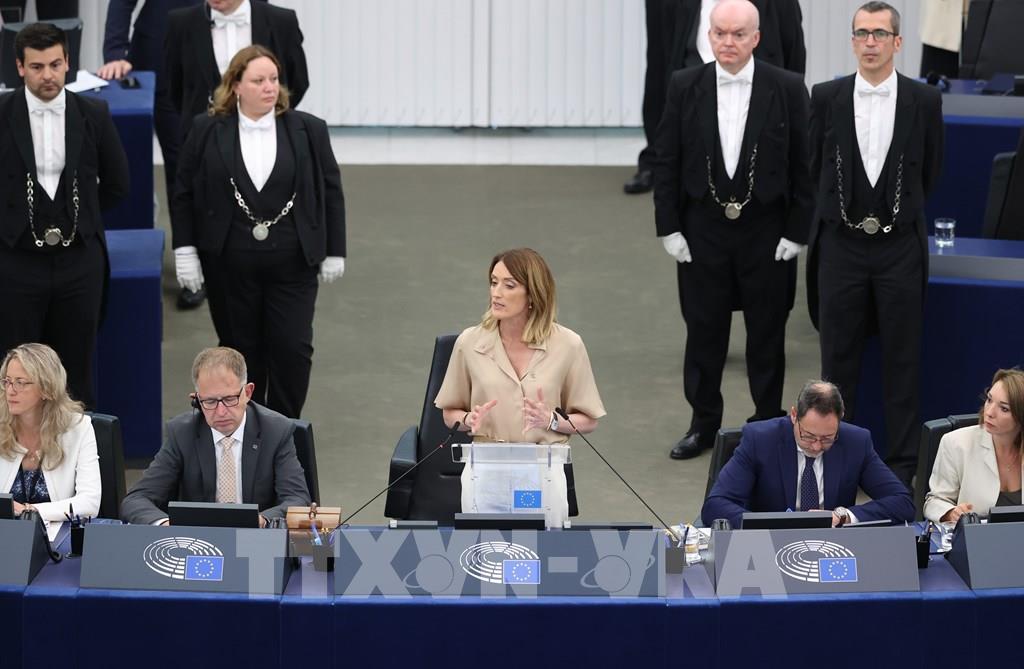 Đến ngày 18/7/2024, Liên minh châu Âu đã kiện toàn các vị trí lãnh đạo chủ chốt, theo đó bà Ursula von der Leyen, 65 tuổi, được các nhà lập pháp EU phê chuẩn tiếp tục giữ chức Chủ tịch Ủy ban châu Âu (EC) thêm một nhiệm kỳ 5 năm với 401 phiếu thuận, 284 phiếu chống và 15 phiếu trắng. Trước đó, chính trị gia người Malta, bà Roberta Metsola (ảnh) cũng tái đắc cử nhiệm kỳ thứ hai chức Chủ tịch Nghị viện châu Âu (EP) với 562 phiếu bầu. Ảnh: THX/TTXVN