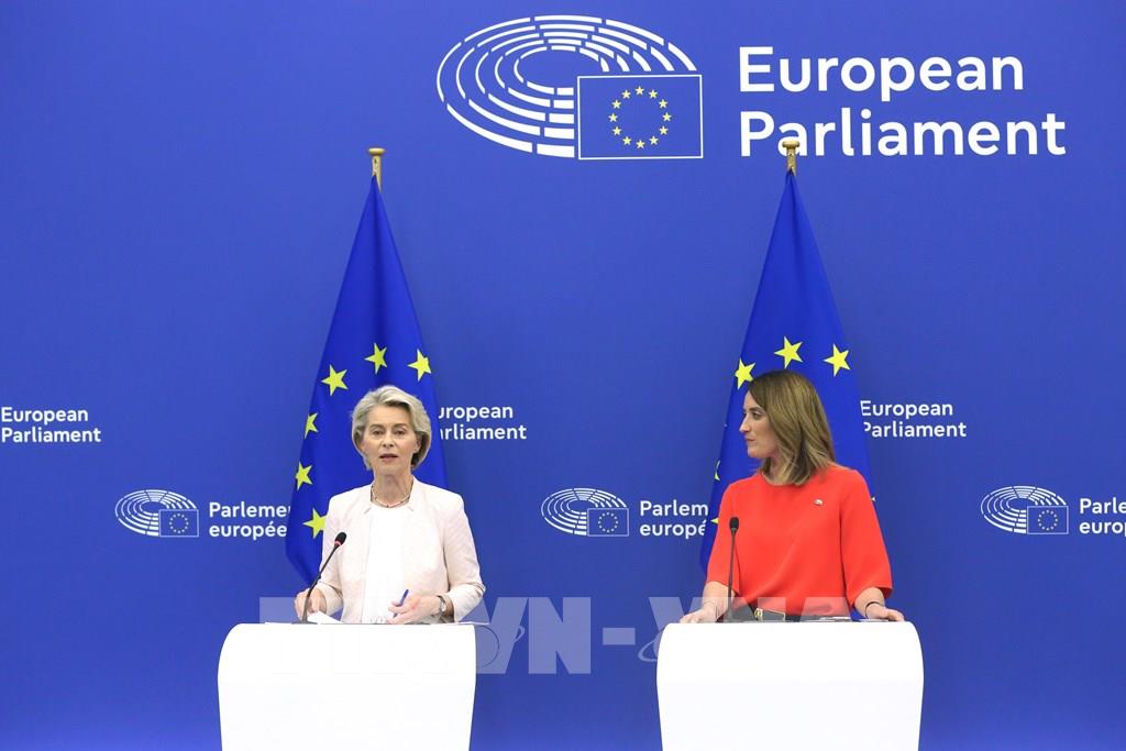 Đến ngày 18/7/2024, Liên minh châu Âu đã kiện toàn các vị trí lãnh đạo chủ chốt, theo đó bà Ursula von der Leyen (trái), 65 tuổi, được các nhà lập pháp EU phê chuẩn tiếp tục giữ chức Chủ tịch Ủy ban châu Âu (EC) thêm một nhiệm kỳ 5 năm với 401 phiếu thuận, 284 phiếu chống và 15 phiếu trắng. Trước đó, chính trị gia người Malta, bà Roberta Metsola (phải) cũng tái đắc cử nhiệm kỳ thứ hai chức Chủ tịch Nghị viện châu Âu (EP) với 562 phiếu bầu. Ảnh: THX/TTXVN