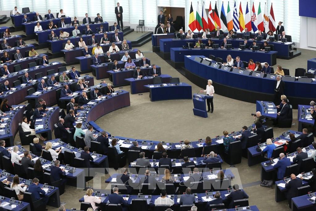 Đến ngày 18/7/2024, Liên minh châu Âu đã kiện toàn các vị trí lãnh đạo chủ chốt, theo đó bà Ursula von der Leyen, 65 tuổi, được các nhà lập pháp EU phê chuẩn tiếp tục giữ chức Chủ tịch Ủy ban châu Âu (EC) thêm một nhiệm kỳ 5 năm với 401 phiếu thuận, 284 phiếu chống và 15 phiếu trắng. Trước đó, chính trị gia người Malta, bà Roberta Metsola cũng tái đắc cử nhiệm kỳ thứ hai chức Chủ tịch Nghị viện châu Âu (EP) với 562 phiếu bầu. Ảnh: Toàn cảnh phiên bỏ phiếu kiện toàn lãnh đạo EU của Nghị viện châu Âu ở Strasbourg (Pháp). THX/TTXVN