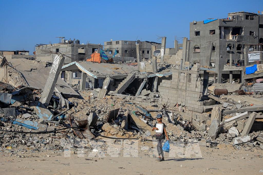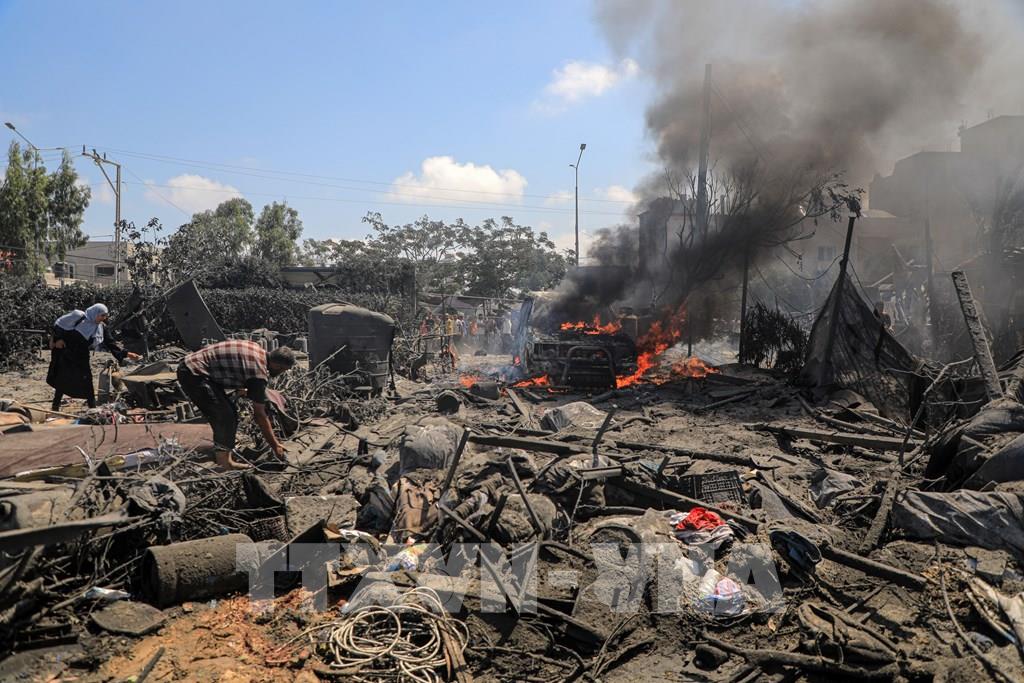 Căng thẳng dọc biên giới giữa Liban và Israel tiếp tục leo thang. Hezbollah bắn 80 quả tên lửa vào miền Bắc Israel. Đáp lại, quân đội Israel đã sử dụng thiết bị bay không người lái cùng máy bay chiến đấu để tiến hành 7 cuộc không kích vào 5 ngôi làng và thị trấn ở khu vực biên giới phía Nam Liban. Trong khi đó, Nhà nước Do Thái cũng tăng cường tấn công Dải Gaza, tập trung vào các trại tị nạn và trường học, làm ít nhất 70 người thiệt mạng, hàng trăm người bị thương. Ảnh: Hiện trường đổ nát sau vụ không kích của Israel xuống các trại tị nạn của người Palestine ở khu vực Mawasi, Dải Gaza. THX/TTXVN