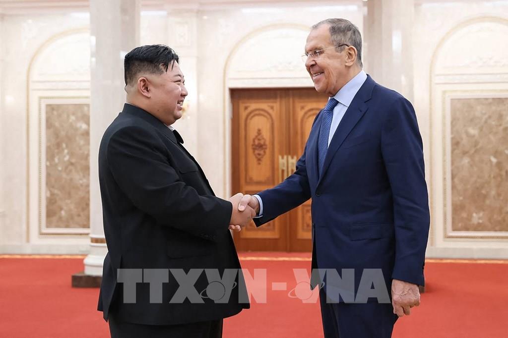 Hãng thông tấn Trung ương Triều Tiên (KCNA) sáng 20/10/2023 cho biết, trong cuộc gặp Ngoại trưởng Nga Sergei Lavrov (phải) đang ở thăm Bình Nhưỡng 2 ngày, nhà lãnh đạo Triều Tiên Kim Jong Un (trái), bày tỏ quyết tâm thực hiện các thỏa thuận đạt được tại hội nghị thượng đỉnh hồi tháng trước với Tổng thống Nga Vladimir Putin. Ảnh: AFP/TTXVN