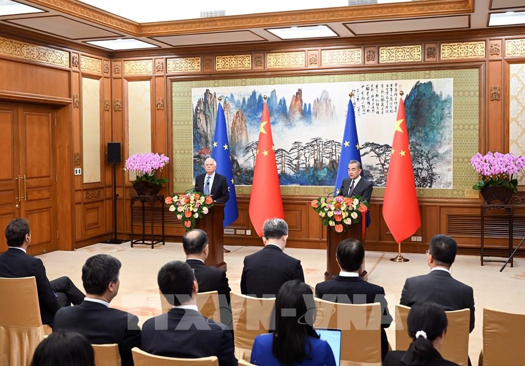 Ngày 13/10/2023, Bộ trưởng Ngoại giao Trung Quốc Vương Nghị cùng Đại diện cấp cao về chính sách đối ngoại - an ninh của Liên minh châu Âu (EU), ông Josep Borrell, đã tiến hành Đối thoại Chiến lược cấp cao Trung Quốc-EU lần thứ 12 ở Bắc Kinh. Tại Đối thoại, ông Vương Nghị khẳng định Trung Quốc rất coi trọng quan hệ với EU và coi EU là một cực độc lập và quan trọng trong một thế giới đa cực. Ảnh: THX/TTXVN