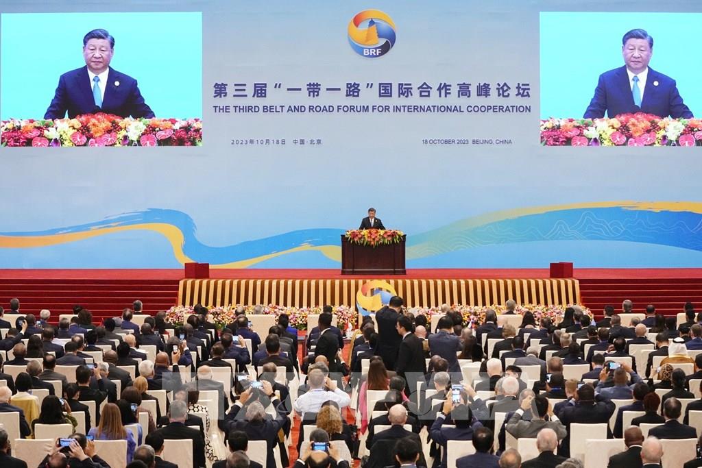 Sáng 18/10/2023, Lễ khai mạc Diễn đàn Cấp cao Hợp tác quốc tế "Vành đai và Con đường" (BRF) lần thứ 3 diễn ra tại thủ đô Bắc Kinh, Trung Quốc, với sự tham dự của các nhà lãnh đạo đến từ hơn 130 quốc gia và 30 tổ chức quốc tế. Chủ tịch nước Võ Văn Thưởng (thứ 3, phải, hàng đầu) dẫn đầu Đoàn đại biểu cấp cao Việt Nam tham dự Diễn đàn. Ảnh: Chủ tịch Trung Quốc Tập Cận Bình phát biểu tại Lễ khai mạc Diễn đàn. Kyodo/TTXVN