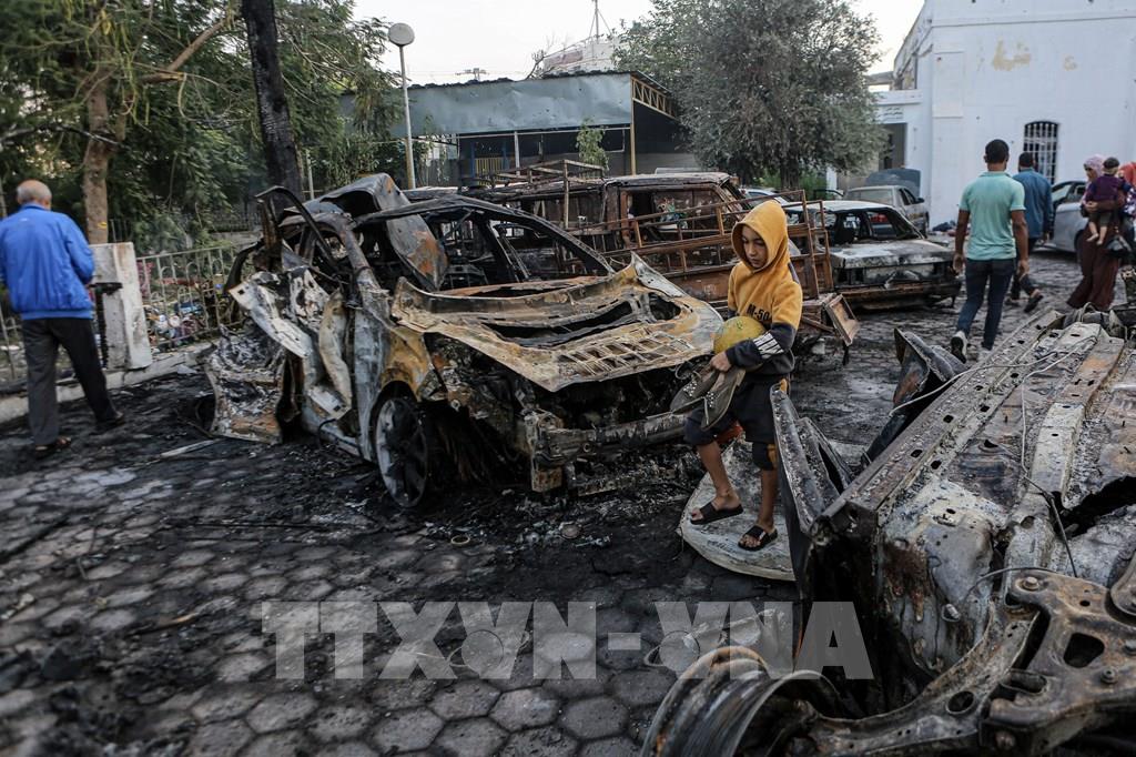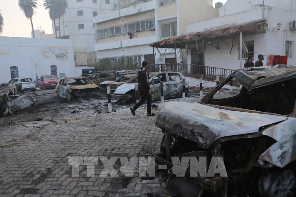 Thông báo của cơ quan y tế chính quyền Hamas đêm 17/10/2023 cho biết một vụ nổ lớn đã làm rung chuyển Bệnh viện Ahli Arab thuộc thành phố Gaza và làm ít nhất 200 người thiệt mạng. Trong khi đó, một số nguồn tin cho rằng có tới 500 nạn nhân tử vong trong vụ việc này. Ảnh: Khu vực Bệnh viện Ahli Arab ở Gaza bị hư hại sau vụ nổ. Ảnh: THX/TTXVN