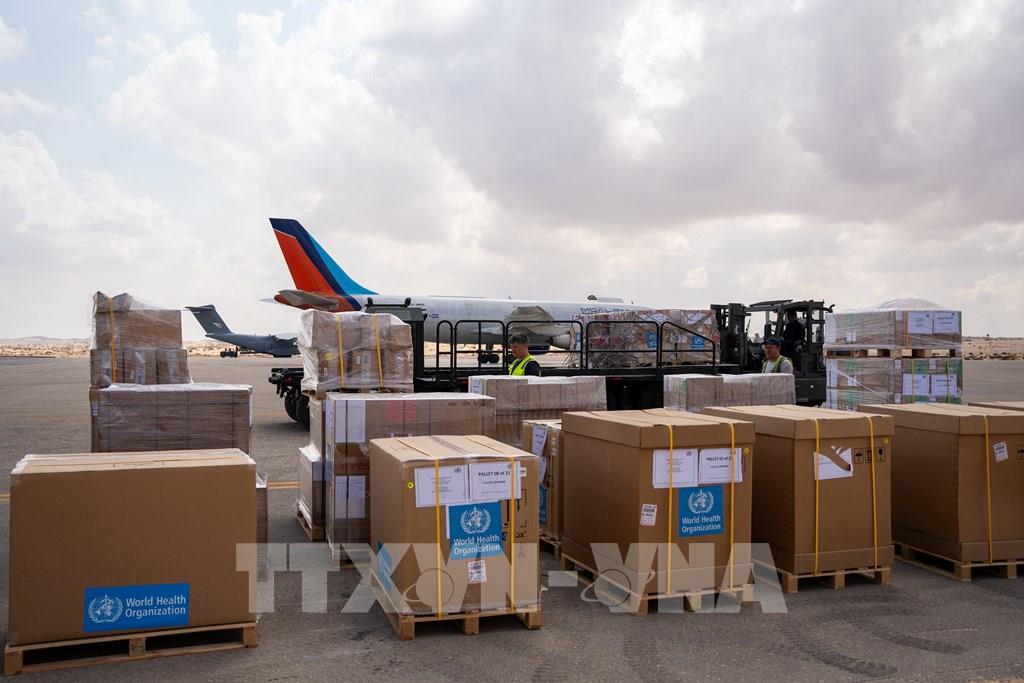 Liên hợp quốc (LHQ) ngày 15/10/2023 cho biết yêu cầu sơ tán của Israel đối với người dân Palestine sống ở phía Bắc Dải Gaza đã gây ra sự “tản cư ồ ạt” về phía Nam của dải đất này. Trước đó, Israel đã yêu cầu 1,1 triệu người Palestine rời khỏi miền Bắc Gaza. Ảnh: Hàng viện trợ của WHO cho Dải Gaza được chuyển tới sân bay ở Bán đảo Sinai, miền Bắc Ai Cập ngày 15/10/2023. AFP/TTXVN