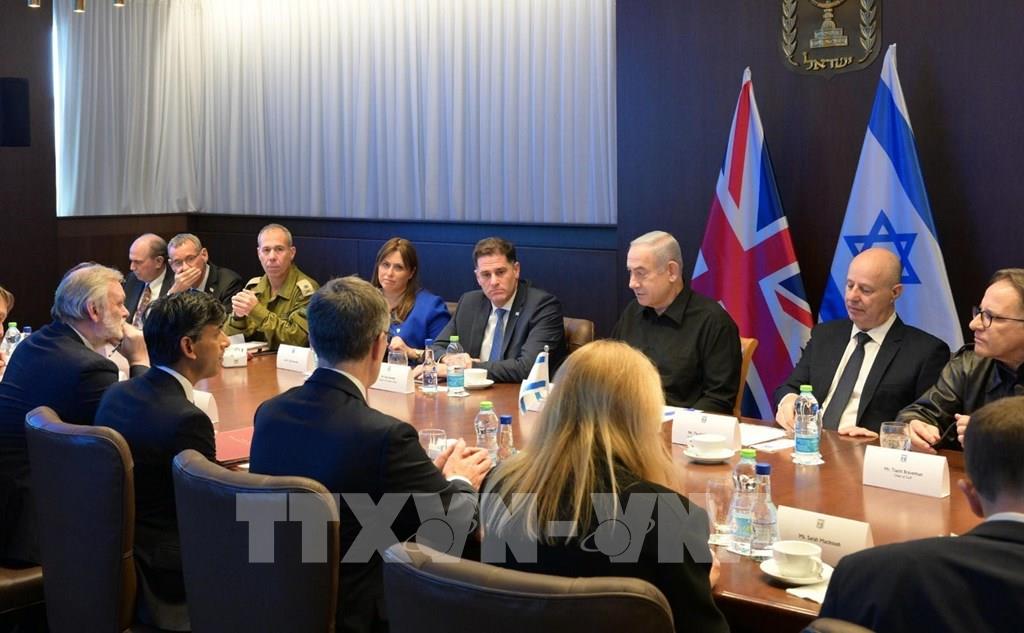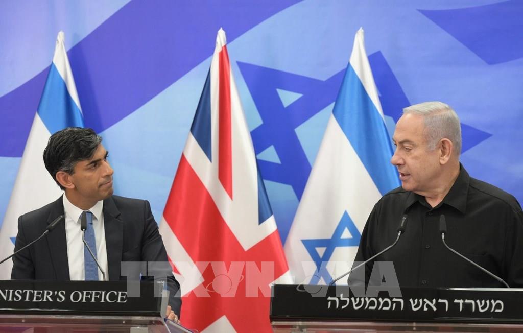 Ngày 19/10/2023, Thủ tướng Anh Rishi Sunak (trái) và Thủ tướng Israel Benjamin Netanyahu (phải) đã nhấn mạnh tầm quan trọng việc không để xung đột Israel-Hamas leo thang và lan rộng ra toàn khu vực Trung Đông, đảm bảo an ninh và ổn định ở khu vực. Hai nhà lãnh đạo đưa ra thông điệp này sau cuộc gặp giữa hai bên tại Israel, trong khuôn khổ chuyến công du của nhà lãnh đạo Anh tới một số nước Trung Đông. Ảnh: GPO/TTXVN