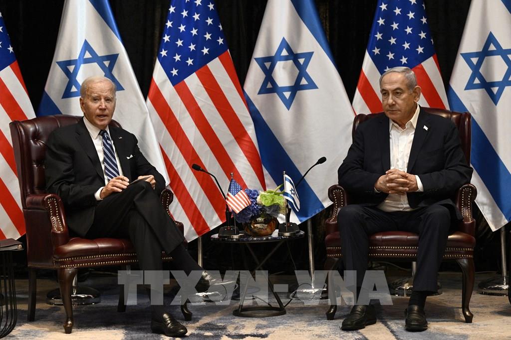 Ngày 18/10/2023, phát biểu sau cuộc họp với nội các khẩn cấp của Israel tại Tel Aviv, Tổng thống Joe Biden khẳng định Mỹ sẽ tiếp tục ủng hộ Israel trong các hoạt động bảo vệ người dân và sẽ tiếp tục phối hợp với Israel và các đối tác ở khu vực để ngăn chặn xảy ra thêm các thảm kịch mà nạn nhân là người dân vô tội trong bối cảnh xung đột tại Dải Gaza. Ảnh: Tổng thống Joe Biden (trái) trong cuộc gặp Thủ tướng Israel Benjamin Netanyahu tại Tel Aviv ngày 18/10/2023. AFP/TTXVN