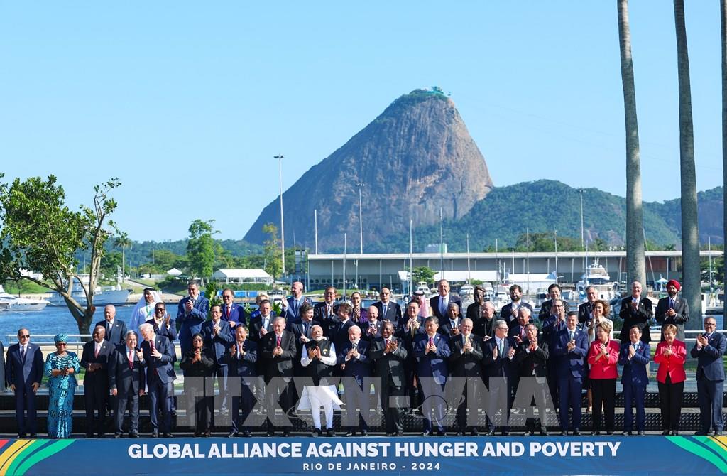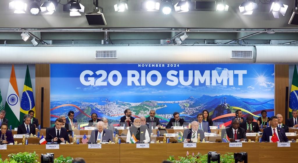Hội nghị thượng đỉnh Nhóm các nền kinh tế phát triển và mới nổi hàng đầu thế giới (G20) diễn ra tại Rio de Janeiro (Brazil) trong hai ngày 18-19/11/2024. Mặc dù hội nghị bị chi phối bởi sự phân hóa rõ rệt trong các vấn đề địa chính trị nhưng các nhà lãnh đạo vẫn đạt được một số thỏa thuận quan trọng, bao gồm việc tăng thuế đối với giới siêu giàu, hỗ trợ tài chính cho biến đổi khí hậu và các cuộc khủng hoảng nhân đạo tại Dải Gaza và Ukraine. Ảnh: ANI/TTXVN
