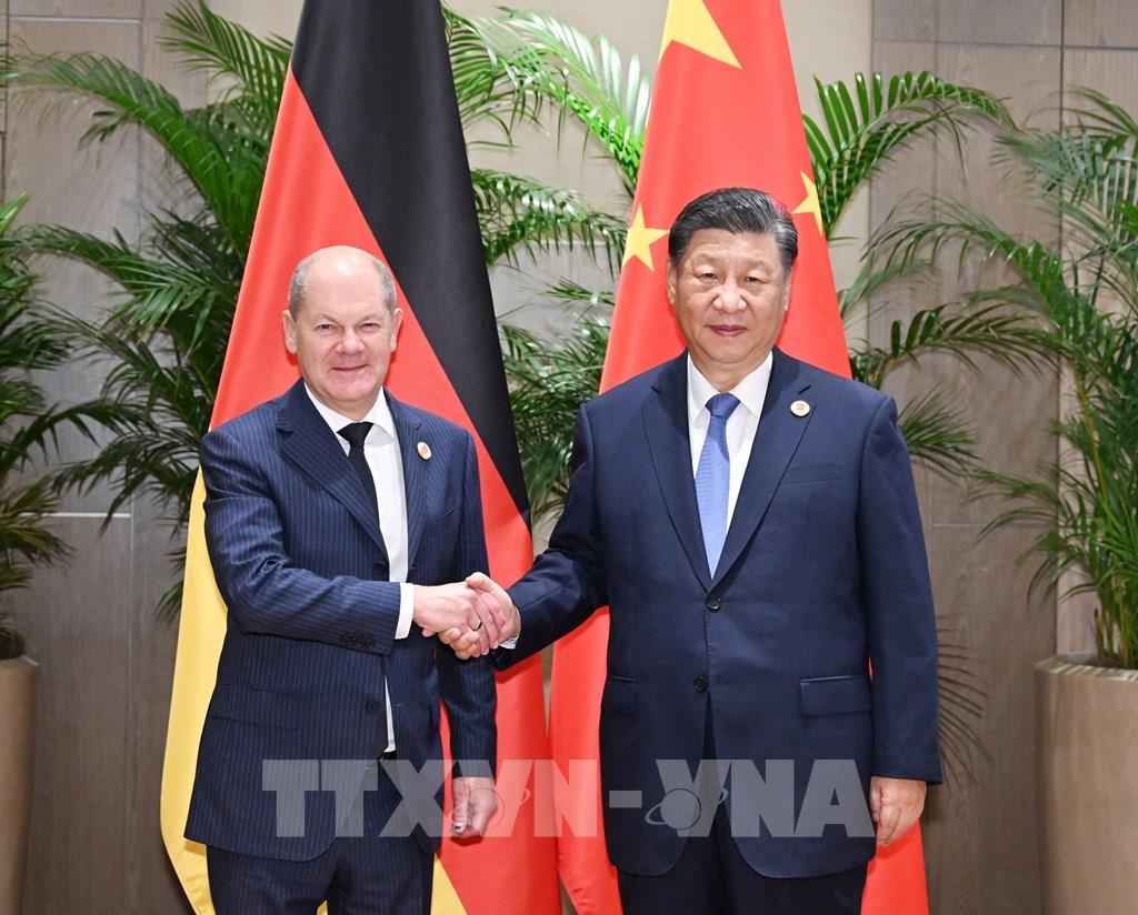 Trong khuôn khổ Hội nghị Thượng đỉnh G20 tại Rio de Janeiro (Brazil), Chủ tịch Trung Quốc Tập Cận Bình (phải) đã có cuộc hội đàm với Thủ tướng Đức Olaf Scholz (trái), nhấn mạnh Trung Quốc coi Đức là đối tác quan trọng trong việc thúc đẩy quá trình hiện đại hóa của đất nước và sẽ tiếp tục đem lại các cơ hội thị trường rộng lớn cho các công ty Đức. Ảnh: THX/TTXVN