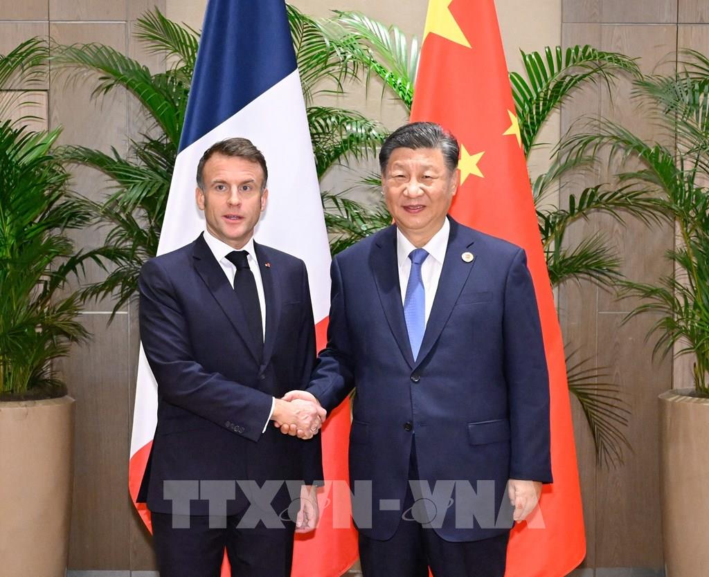 Trong khuôn khổ Hội nghị Thượng đỉnh G20 tại Rio de Janeiro (Brazil), Chủ tịch Trung Quốc Tập Cận Bình (phải) đã có cuộc hội đàm với Tổng thống Pháp Emmanuel Macron (trái), bày tỏ Trung Quốc sẵn sàng hợp tác với Pháp để làm sâu sắc đối thoại chiến lược, củng cố hợp tác cùng có lợi, cùng ứng phó với những thay đổi và thách thức. Ảnh: THX/TTXVN