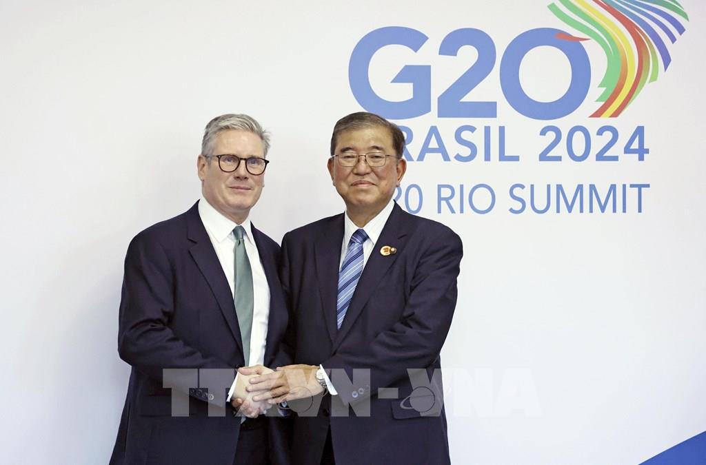 Ngày 18/11/2024, Thủ tướng Nhật Bản Shigeru Ishiba (phải) và Thủ tướng Anh Keir Starmer đã gặp nhau bên lề Hội nghị thượng đỉnh G20 ở Rio de Janeiro, Brazil. Hai bên nhất trí khởi động khuôn khổ mới cho đối thoại song phương giữa các bộ trưởng kinh tế và ngoại giao, tập trung vào các vấn đề thương mại, an ninh kinh tế và các thách thức chung mà hai quốc gia đang đối mặt. Ảnh: Kyodo/TTXVN