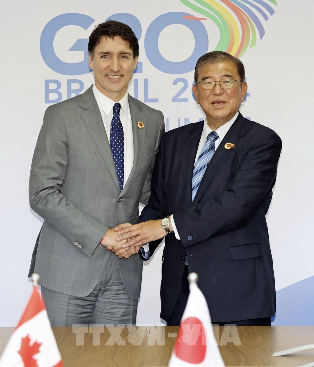 Ngày 18/11/2024, Thủ tướng Nhật Bản Shigeru Ishiba (phải) và Thủ tướng Canada Justin Trudeau đã gặp nhau bên lề Hội nghị thượng đỉnh G20 ở Rio de Janeiro, Brazil. Hai bên nhất trí tăng cường hợp tác kinh tế trong các lĩnh vực như pin xe điện và khí đốt tự nhiên hóa lỏng (LNG). Ảnh: Kyodo/TTXVN