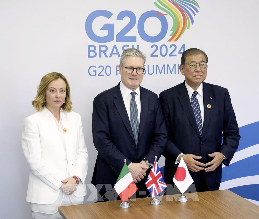 Nhật Bản, Anh và Italy đã nhất trí phối hợp chặt chẽ phát triển chiến đấu cơ thế hệ mới trong dự án chung mà Tokyo kỳ vọng sẽ là "nền tảng" cho mối quan hệ hợp tác sâu rộng hơn trong những thập kỷ tới. Thủ tướng Nhật Bản Shigeru Ishiba, Thủ tướng Anh Keir Starmer và Thủ tướng Italy Giorgia Meloni đã đạt được đồng thuận này tại cuộc gặp bên lề Hội nghị thượng đỉnh G20 ở Rio de Janeiro, Brazil ngày 19/11/2024. Ảnh: Kyodo/TTXVN