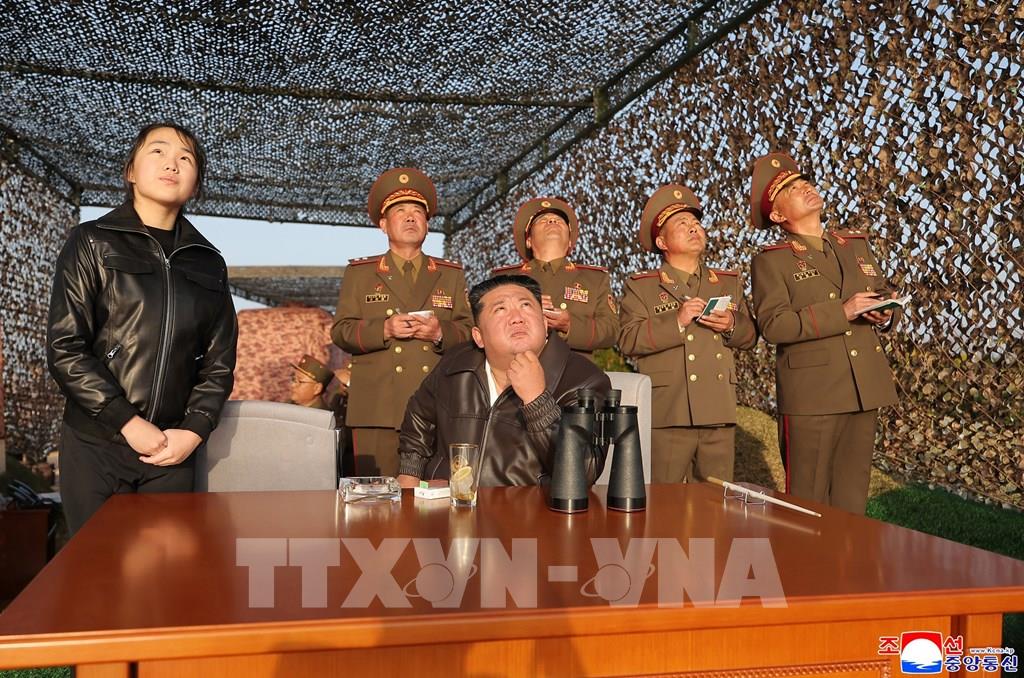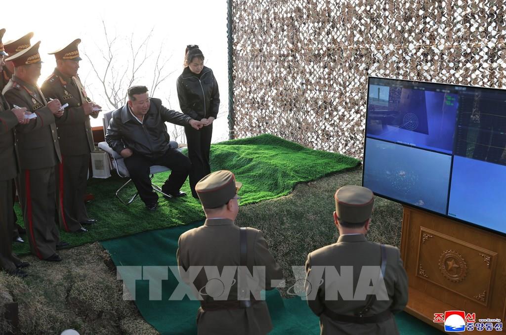 Ngày 20/4/2026, hãng Thông tấn Trung ương Triều Tiên (KCNA) đưa tin nước này đã tiến hành vụ thử tên lửa đạn đạo chiến thuật đất đối đất Hwasongpho-11 Ra. trước đó 1 ngày nhằm đánh giá khả năng mang đầu đạn chùm của loại tên lửa này. Nhà lãnh đạo Triều Tiên Kim Jong Un trực tiếp giám sát vụ thử. KCNA nêu rõ 5 tên lửa đã được phóng về khu vực mục tiêu cách khoảng 136 km và hệ thống vũ khí này đã chứng tỏ được khả năng tấn công chính xác. Ảnh: KCNA/TTXVN