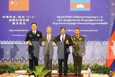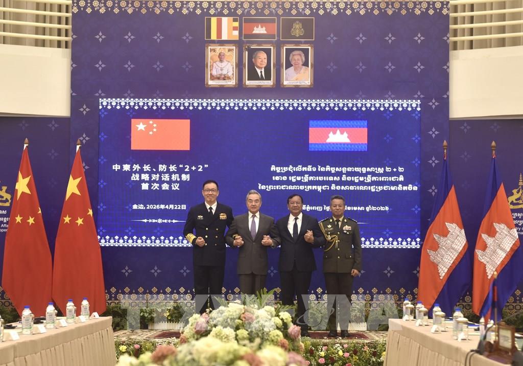 Trung Quốc, Campuchia đã đạt 6 điểm đồng thuận tại cuộc họp theo cơ chế đối thoại chiến lược 2+2 giữa Bộ trưởng Ngoại giao và Bộ trưởng Quốc phòng hai nước tại thủ đô Phnom Penh. Thông tin trên do Bộ trưởng Ngoại giao Trung Quốc Vương Nghị công bố với báo giới ngày 23/4/2026, sau khi kết thúc các trao đổi tại thủ đô của Campuchia. Ảnh: Kyodo/TTXVN