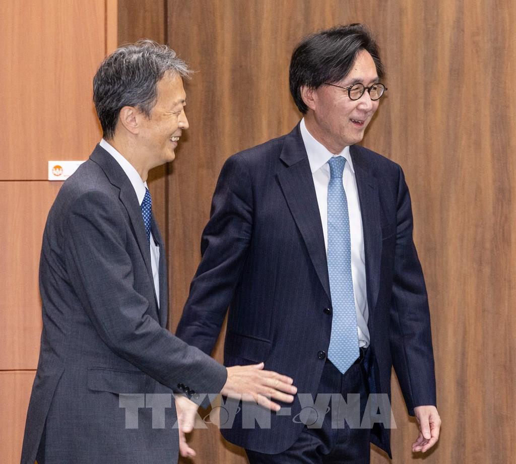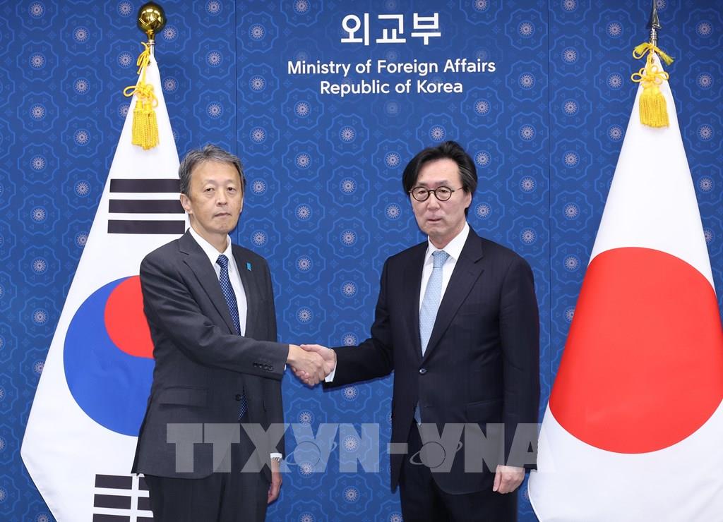 Hãng tin Yonhap cho biết Hàn Quốc và Nhật Bản đã tổ chức cuộc hội đàm cấp thứ trưởng tại Seoul ngày 5/10/2023, đánh dấu cuộc đối thoại chiến lược đầu tiên sau 9 năm. Theo đó, Thứ trưởng Ngoại giao thứ nhất Hàn Quốc Chang Ho-jin (ảnh, phải) đã gặp người đồng cấp Nhật Bản Masataka Okano để thảo luận về "đối thoại chiến lược" nhằm giải quyết nhiều vấn đề trong chương trình nghị sự, từ quan hệ song phương đến các vấn đề khu vực và toàn cầu. Yonhap/TTXVN