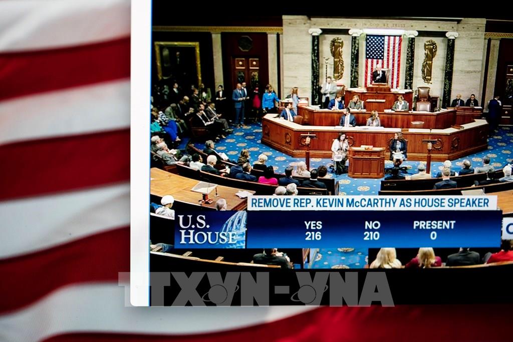 Ngày 3/10/2023, với 216 phiếu thuận và 210 phiếu chống, các nghị sĩ tại Hạ viện Mỹ đã thông qua quyết định bãi nhiệm Chủ tịch Hạ viện Kevin McCarthy (ảnh). Đây là lần đầu tiên trong lịch sử Hạ viện Mỹ cách chức nhà lãnh đạo của mình, theo đề xuất của một nhóm nhỏ các đảng viên Cộng hòa do Hạ nghị sĩ Matt Gaetz đứng đầu. Các đảng viên này bày tỏ bất bình vì ông McCarthy hôm 30/9 đã dựa vào phiếu bầu của đảng Dân chủ để thông qua dự luật cấp ngân sách cho Chính phủ tiếp tục hoạt động thêm 45 ngày, tới 17/11. Ảnh: THX/TTXVN