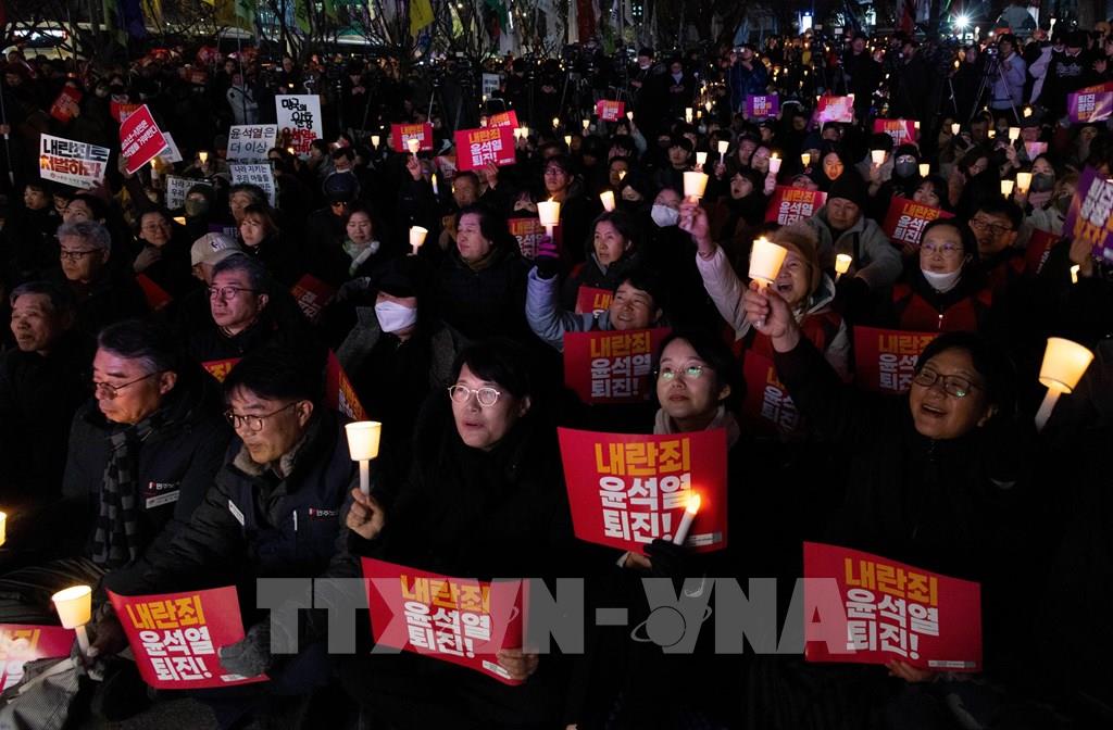 Các cuộc tuần hành đang lan rộng trên toàn Hàn Quốc trong ngày thứ hai liên tiếp, kêu gọi Tổng thống Hàn Quốc Yoon Suk Yeol từ chức sau quyết định ban bố tình trạng thiết quân luật đêm 3/12, dù đã dỡ bỏ vào rạng sáng 4/12/2024. Đây sẽ là áp lực lớn với Tổng thống và đảng Quyền lực quốc dân (PPP) cầm quyền, trước cuộc bỏ phiếu tại Quốc hội về dự luật luận tội Tổng thống, dự kiến diễn ra tối 7/12. Ảnh: THX/TTXVN