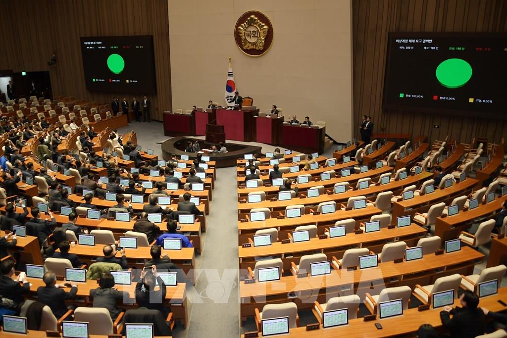 Ngày 4/12/2024, Quốc hội Hàn Quốc đã thông qua nghị quyết yêu cầu dỡ bỏ lệnh thiết quân luật do Tổng thống Yoon Suk-yeol ban bố vào tối 3/12. Phiên họp toàn thể của Quốc hội Hàn Quốc có sự tham dự của 190 nghị sĩ thuộc đảng cầm quyền và đảng đối lập. Kết quả 100% nghị sĩ có mặt đã nhất trí tán thành yêu cầu dỡ bỏ thiết quân luật. Ảnh: Yonhap/TTXVN