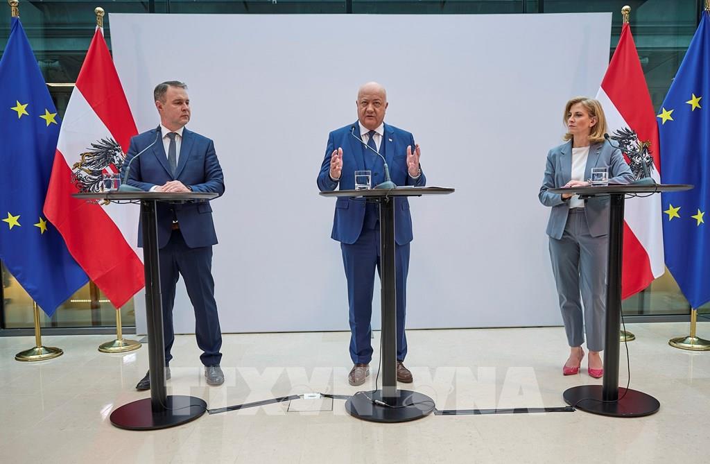 Ngày 3/3/2025, Áo đã chính thức thành lập chính phủ liên minh trung dung gồm 3 đảng (Nhân dân bảo thủ (OVP), Dân chủ Xã hội (SPO) và Tự do Neos), lần đầu tiên kể từ sau Chiến tranh Thế giới thứ hai, và chấm dứt khoảng thời gian chờ đợi lâu nhất trong lịch sử nước này để có một chính phủ mới. Ảnh (từ trái sang): Lãnh đạo đảng SPO Andreas Babler, lãnh đạo đảng OVP Christian Stocker và lãnh đạo đảng Tự do Neos Beate Meinl-Reisinger trong cuộc họp báo tại Vienna, Áo ngày 27/2/2025. Ảnh: THX/TTXVN