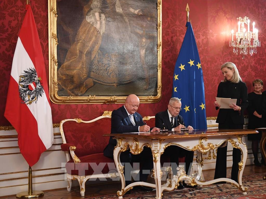 Ngày 3/3/2025, Áo đã chính thức thành lập chính phủ liên minh trung dung gồm 3 đảng (Nhân dân bảo thủ (OVP), Dân chủ Xã hội (SPO) và Tự do Neos), lần đầu tiên kể từ sau Chiến tranh Thế giới thứ hai, và chấm dứt khoảng thời gian chờ đợi lâu nhất trong lịch sử nước này để có một chính phủ mới. Ảnh: Tổng thống Áo Alexander Van der Bellen (giữa) và lãnh đạo đảng OVP Christian Stocker (trái) tại lễ nhậm chức của Nội các mới ở Vienna ngày 3/3/2025. THX/TTXVN