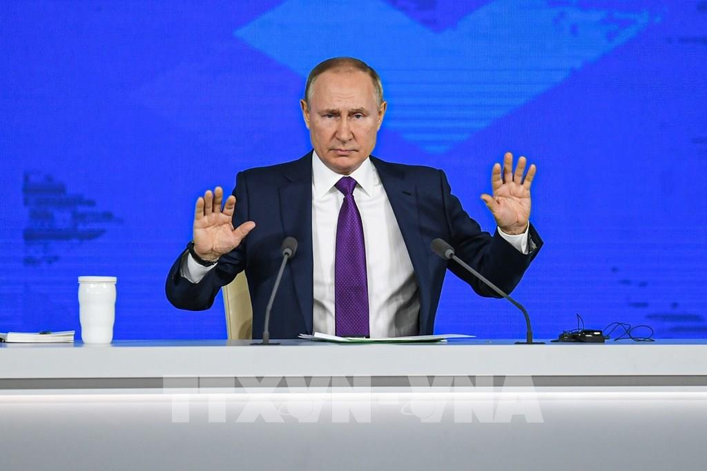 Ngày 23/12/2021, Tổng thống Nga Vladimir Putin (ảnh) tiến hành cuộc họp báo thường niên lần thứ 18 tại trung tâm triển lãm Manezh ở thủ đô Moskva. Cuộc họp báo chú trọng đến các vấn đề đối nội của nước Nga như giá thực phẩm tăng, lương hưu, thế chấp, đường sá xuống cấp, nợ lương, các vấn đề về y tế. Về chính sách đối ngoại, cuộc họp báo tập trung về các vấn đề như Ukraine, NATO mở rộng về phía Đông, cuộc khủng hoảng khí đốt ở châu Âu, tình hình ở Nagorny-Karabakh, mối quan hệ Nga-Trung Quốc. Ảnh: THX/TTXVN