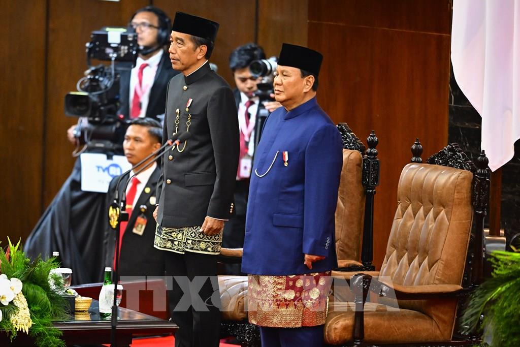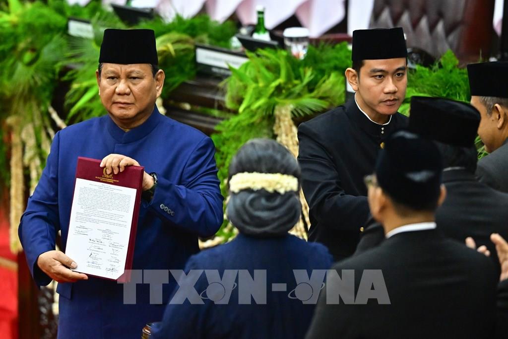 Ngày 20/10/2024, ông Prabowo Subianto (trái) chính thức trở thành Tổng thống của Indonesia và ông Gibran Rakabuming Raka trở thành Phó Tổng thống. Buổi lễ nhậm chức diễn ra tại Tòa nhà Nusantara, Khu phức hợp Nghị viện Senayan, Jakarta. Ảnh: THX/TTXVN