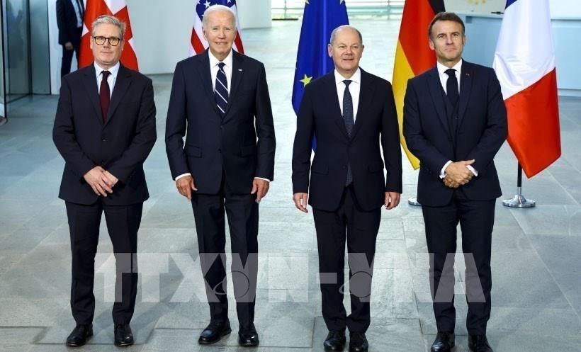 Tổng thống Mỹ Joe Biden, Thủ tướng Đức Olaf Scholz, Tổng thống Pháp Emmanuel Macron và Thủ tướng Anh Keir Starmer ngày 18/10/2024 đã nhấn mạnh “sự khẩn thiết” phải chấm dứt cuộc chiến kéo dài hơn một năm ở Dải Gaza giữa Israel và phong trào Hamas. Trong ảnh: (Từ trái sang) Thủ tướng Anh Keir Starmer, Tổng thống Mỹ Joe Biden, Thủ tướng Đức Olaf Scholz và Tổng thống Pháp Emmanuel Macron trong cuộc gặp tại Berlin, ngày 18/10/2024. Ảnh: DPA/TTXVN