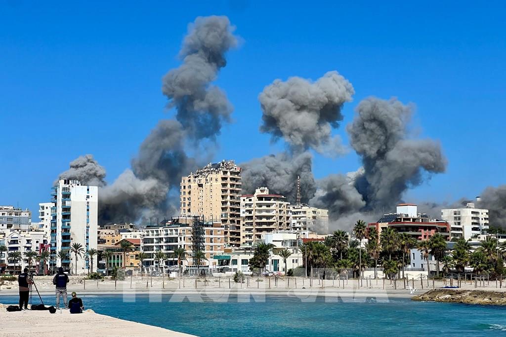 Ngày 20/10/2024, máy bay chiến đấu của Israel đã dội bom xuống các chi nhánh của Al Qard Al Hassan - tổ chức tài chính có liên hệ với lực lượng Hezbollah ở Liban. Theo kênh truyền hình địa phương al-Jadeed, chi nhánh của Al Qard Al Hassan ở Chiyah, ngoại ô phía Nam thủ đô Beirut đã bị tấn công. Trong ảnh: Khói bốc lên sau cuộc không kích của Israel tại Tyre, Liban. Ảnh: THX/TTXVN